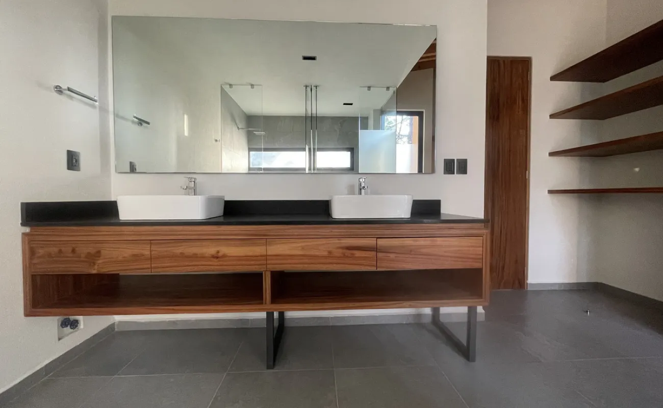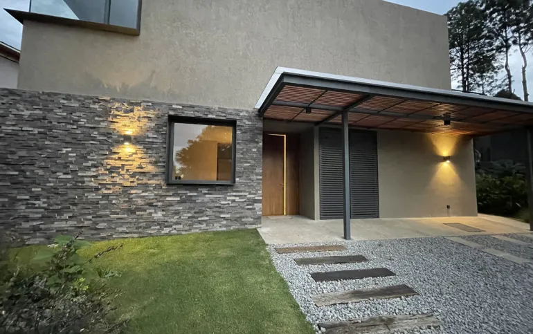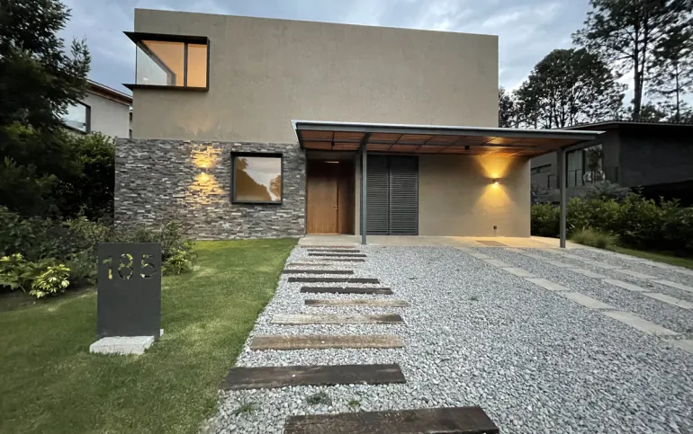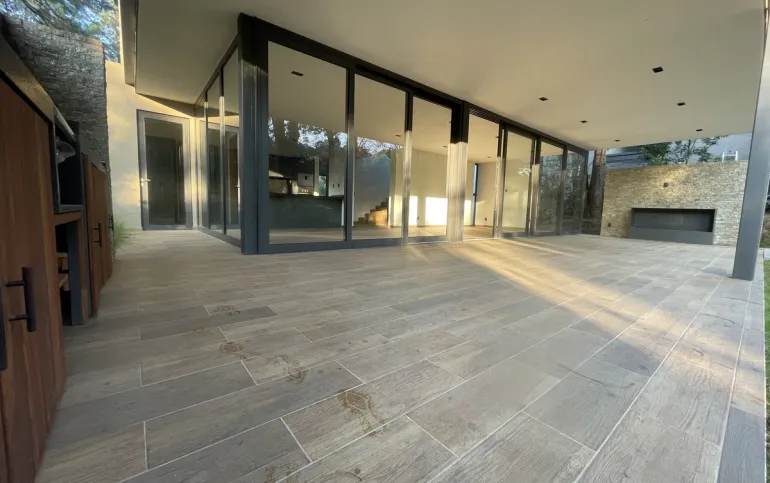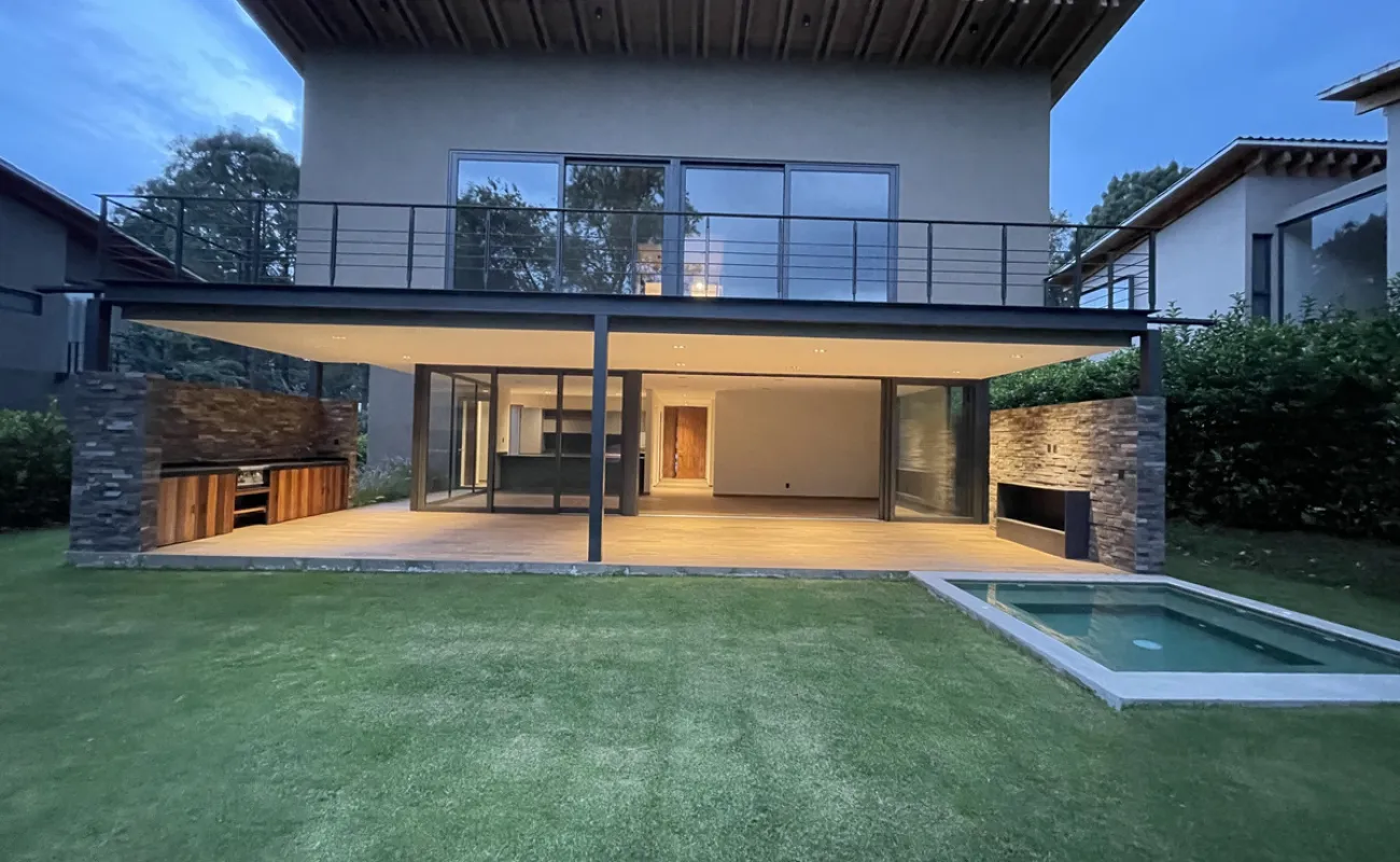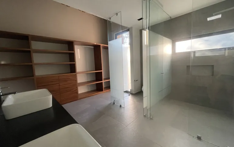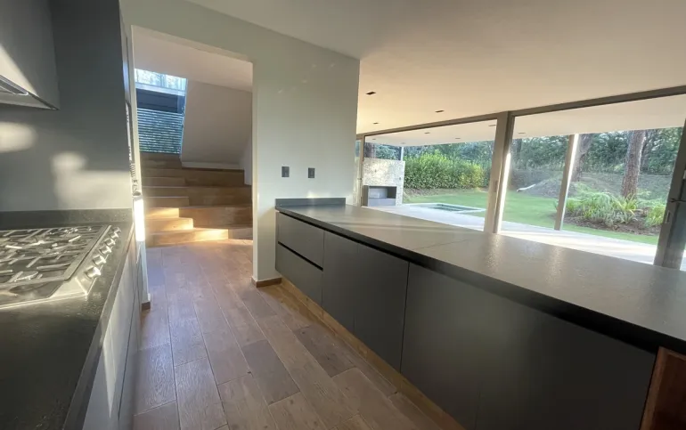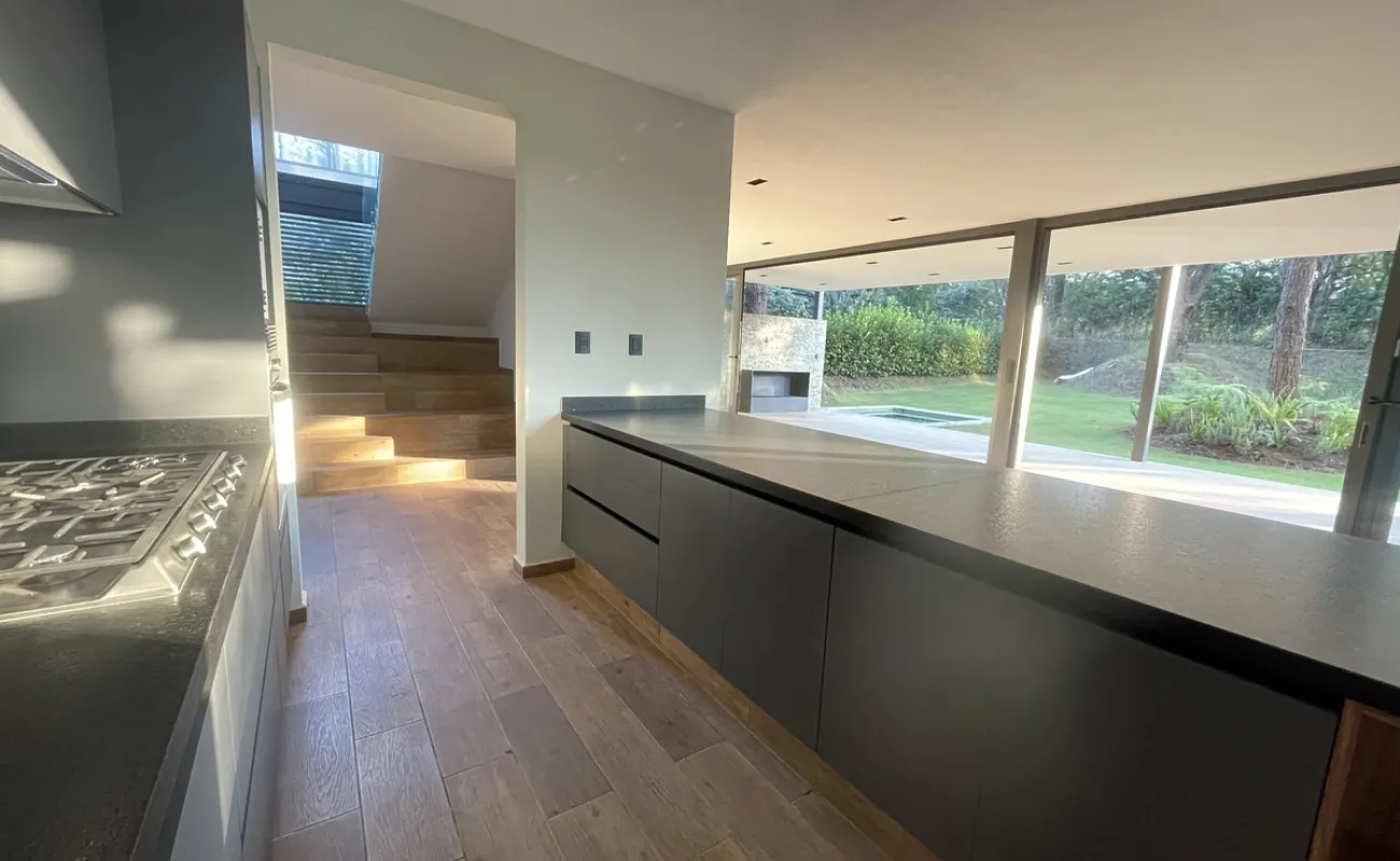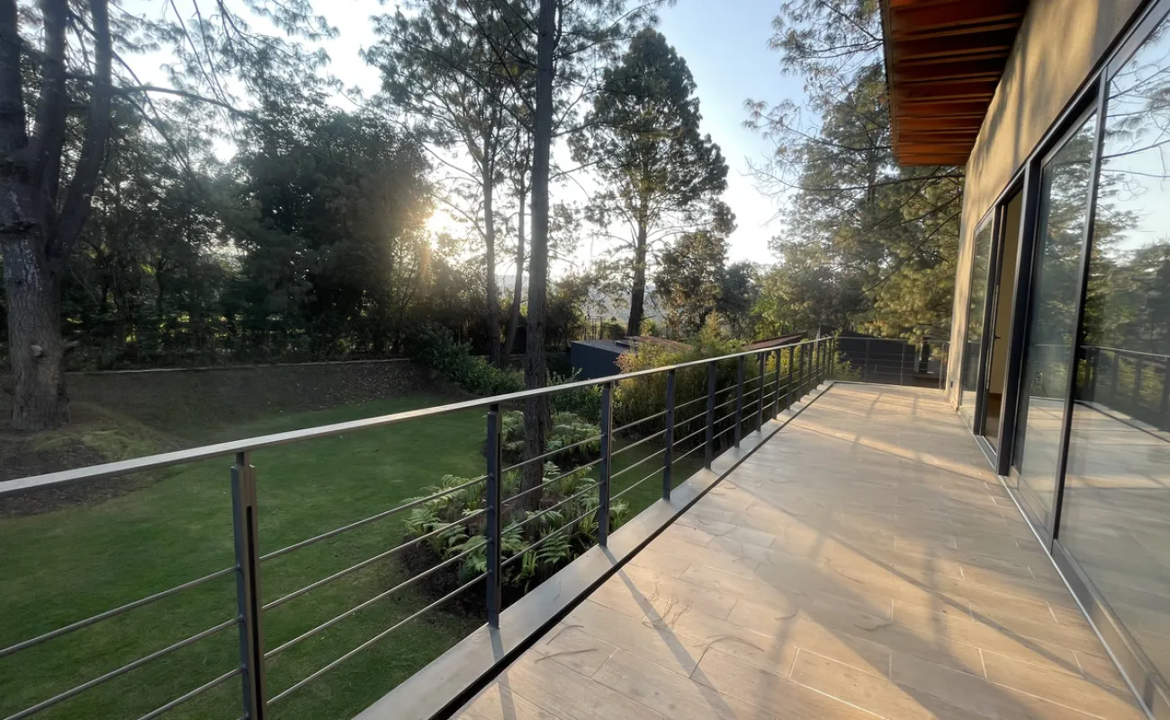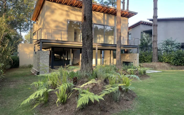 En planta alta 4 recamaras todas con baño y vestidor, techos con excelente altura y con vigas de madera. Dos de ellas con un balcón grande con vista al bosque, otra de ellas con terracita.