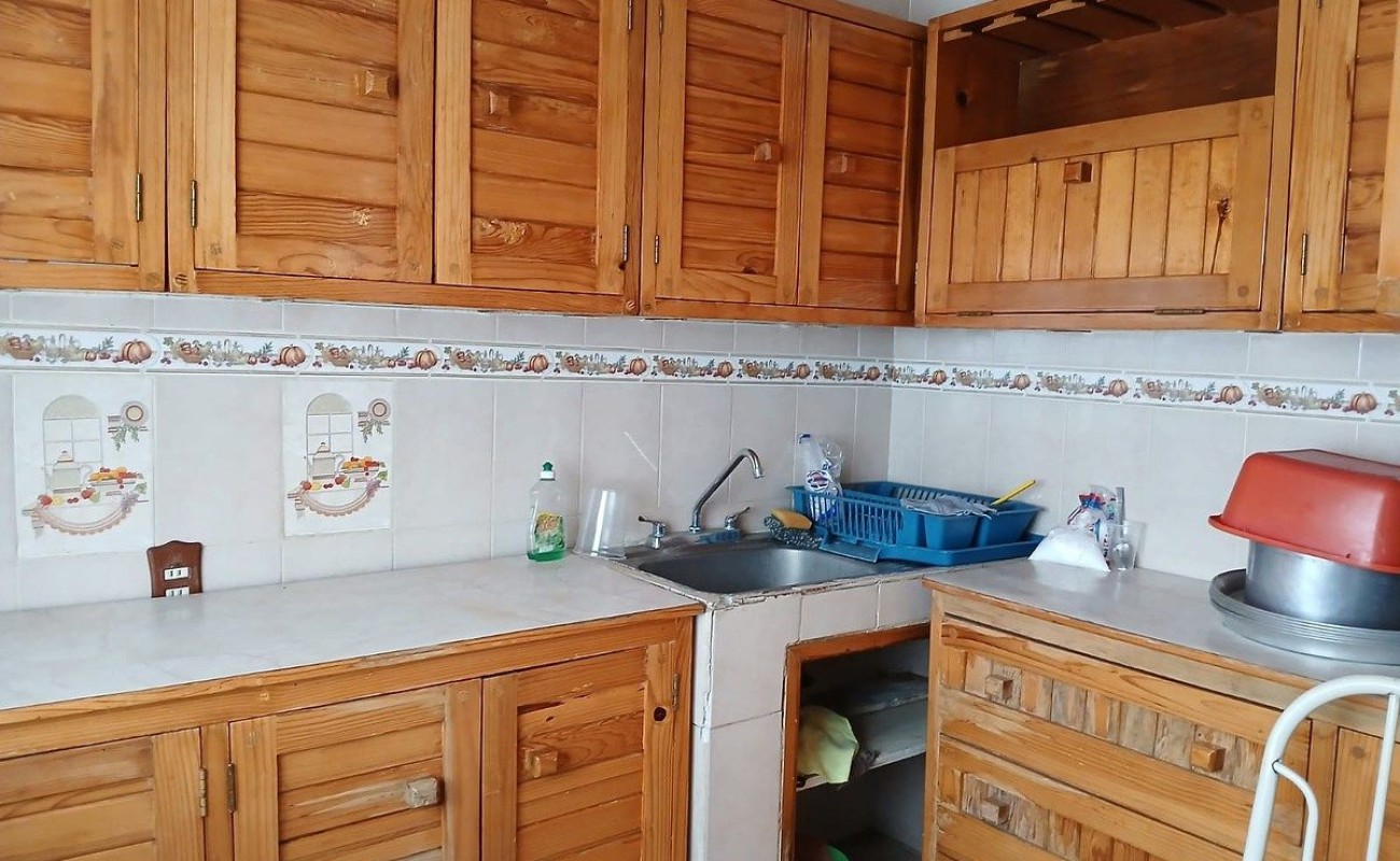 Cocina construida en mampostería, con puertas de madera, de diseño tradicional y funcional.