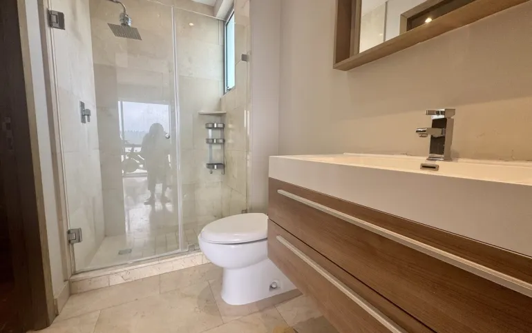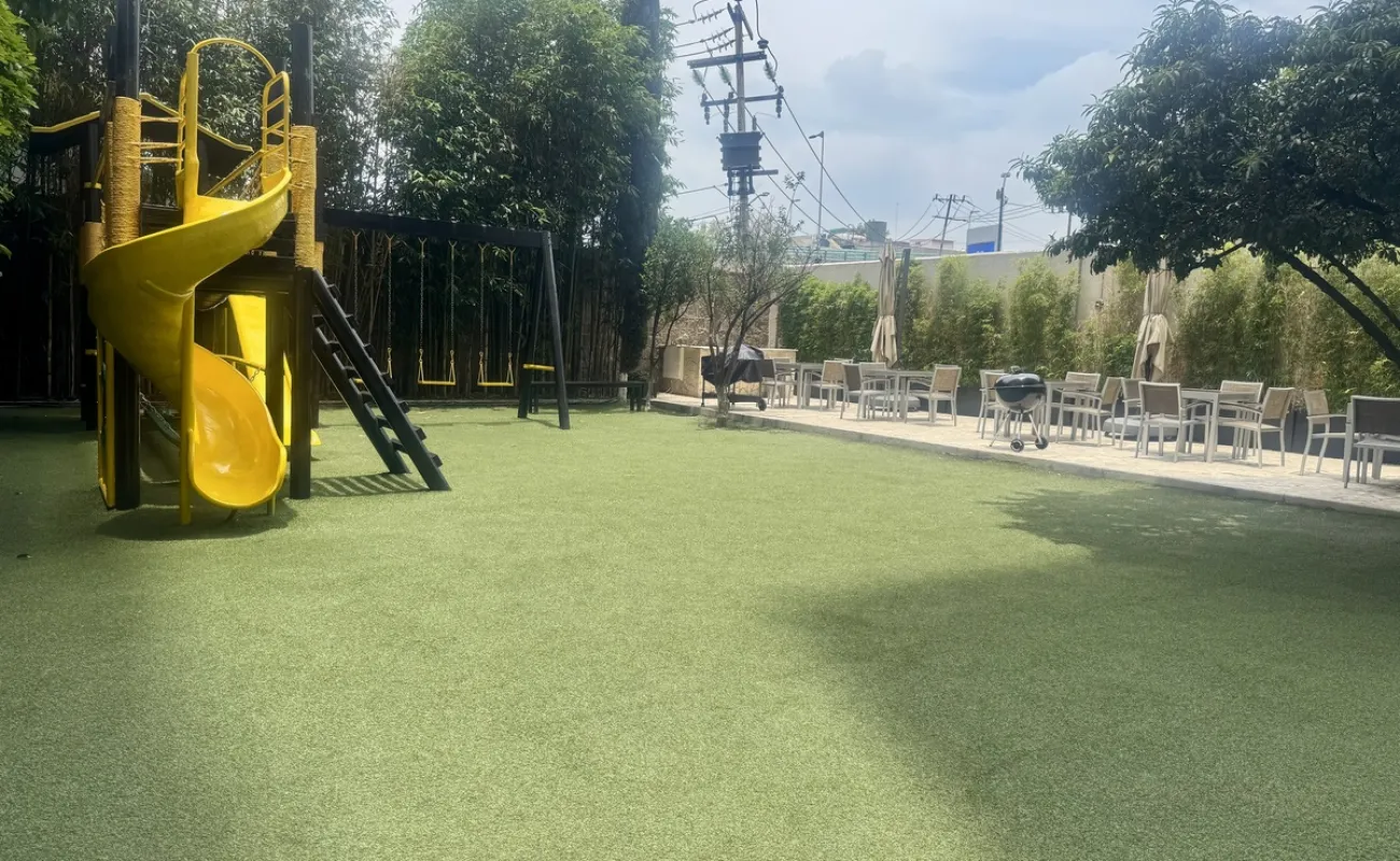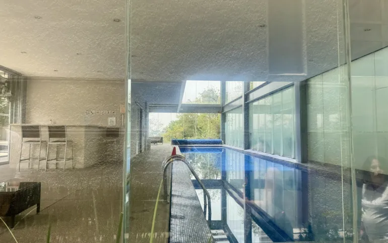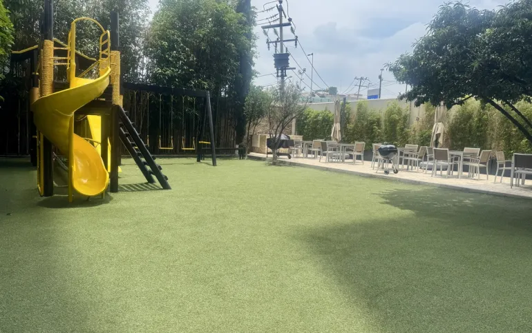 alberca semiolímpica con baños, vestidores y sauna, jacuzzi, asoleaderos, ludoteca, gimnasio, cabinas de masajes, terraza con asadores, y salón de eventos para 100 personas.