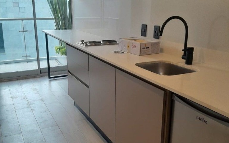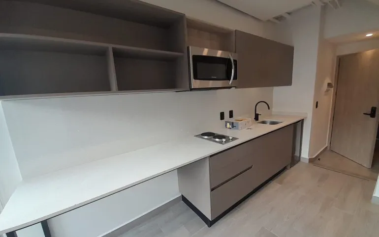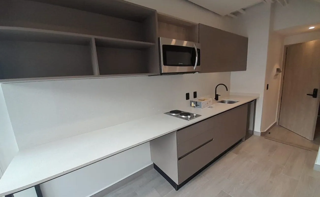 cocina integral equipada con hornillas eléctricas, minibar y microondas