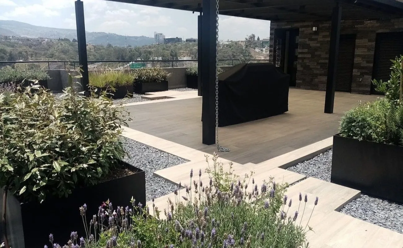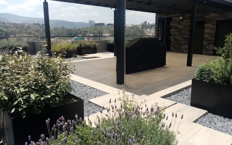 En el área social se encuentra la escalera para subir al Roof Garden privado de 140 m2 con preciosa pérgola y asador.